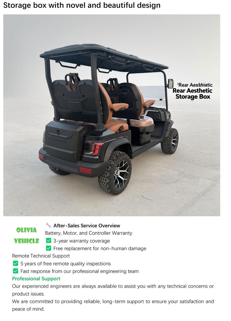 The Oliviavehicle Black 4 Seat 2026 New Type Electric Golf Cart combines elegant design with outstanding performance. Powered by a 72V electric system, it delivers smooth driving, excellent handling, and quiet operation. Perfect for golf courses, resorts, residential communities, and sightseeing tours.